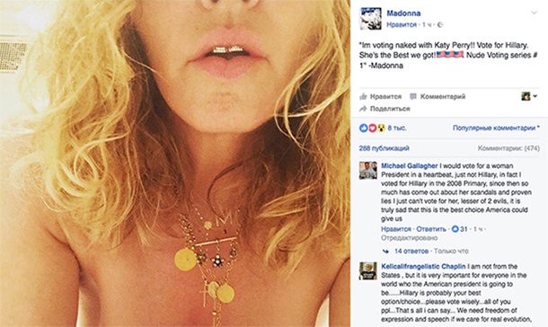 «Я голосую голые вместе с Кэти Перри. Голосуйте за Хиллари. Это лучшее, что у нас есть», — подписала Мадонна.